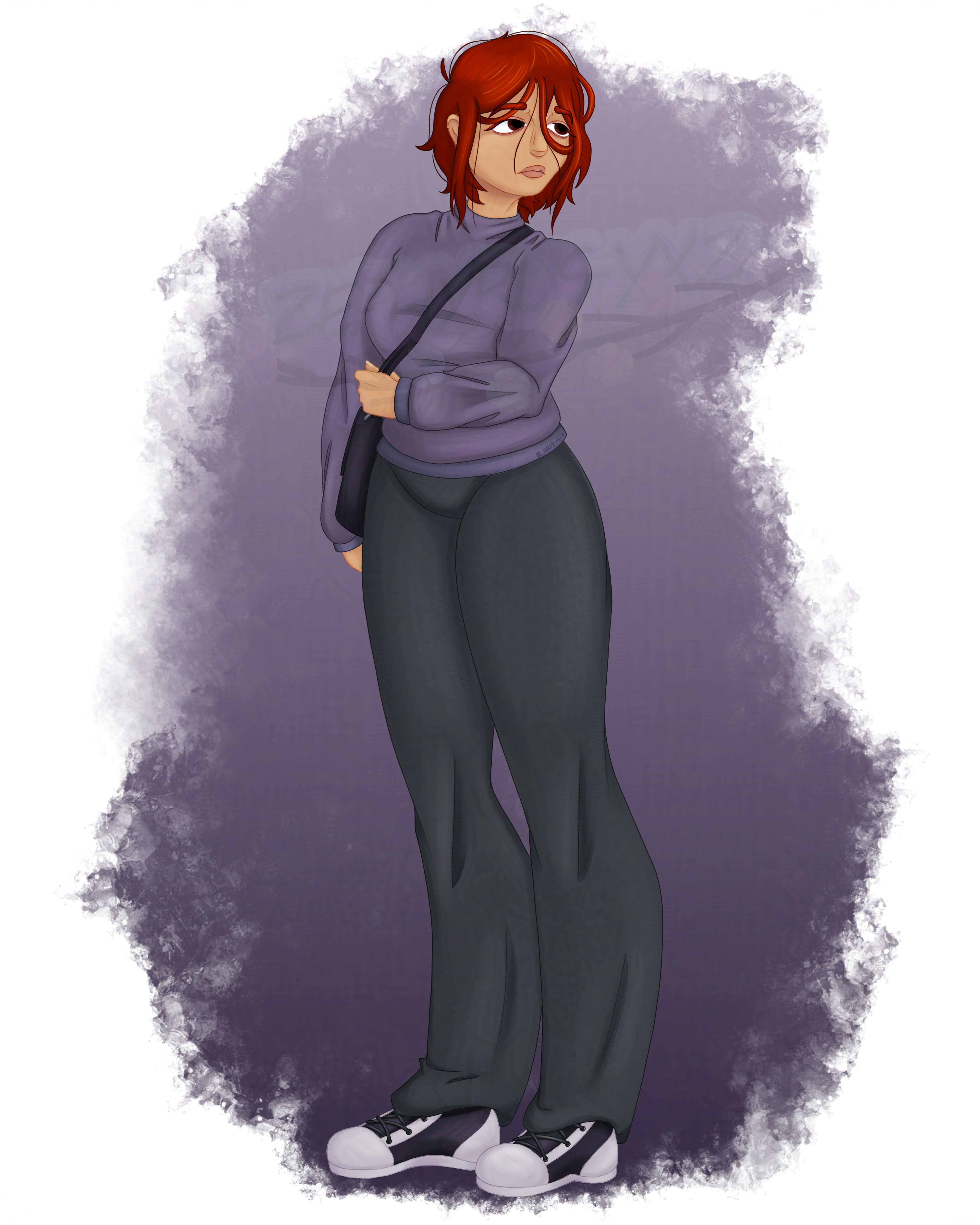 Image Description: A fullbody illustration of Zephyr, Zeph's character. Zephyr is a Human with disheveled red-brown hair that reaches the base of their neck, tired and droopy brown eyes, and a light tan-ish skin color. They wear a purple sweater, grey sweatpants, and purple sneakers. They have a dark purple bag slung over their shoulders.Image Description: A fullbody illustration of Zephyr, Zeph's character. Zephyr is a Human with disheveled red-brown hair that reaches the base of their neck, tired and droopy brown eyes, and a light tan-ish skin color. They wear a purple sweater, grey sweatpants, and purple sneakers. They have a dark purple bag slung over their shoulders.0 Comments 0 Shares 6 Views